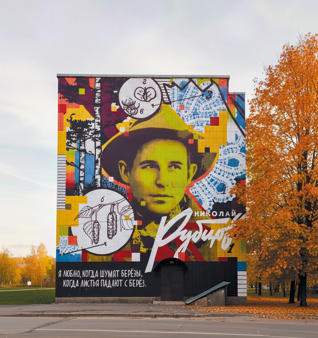 Авторы создали сложную, многослойную композицию, посвященную творчеству известного вологодского поэта Николая Рубцова. Традиционные вологодские кружева и березы органично переплетаются с современными элементами – пикселями, сносками, вставками из учебника биологии.