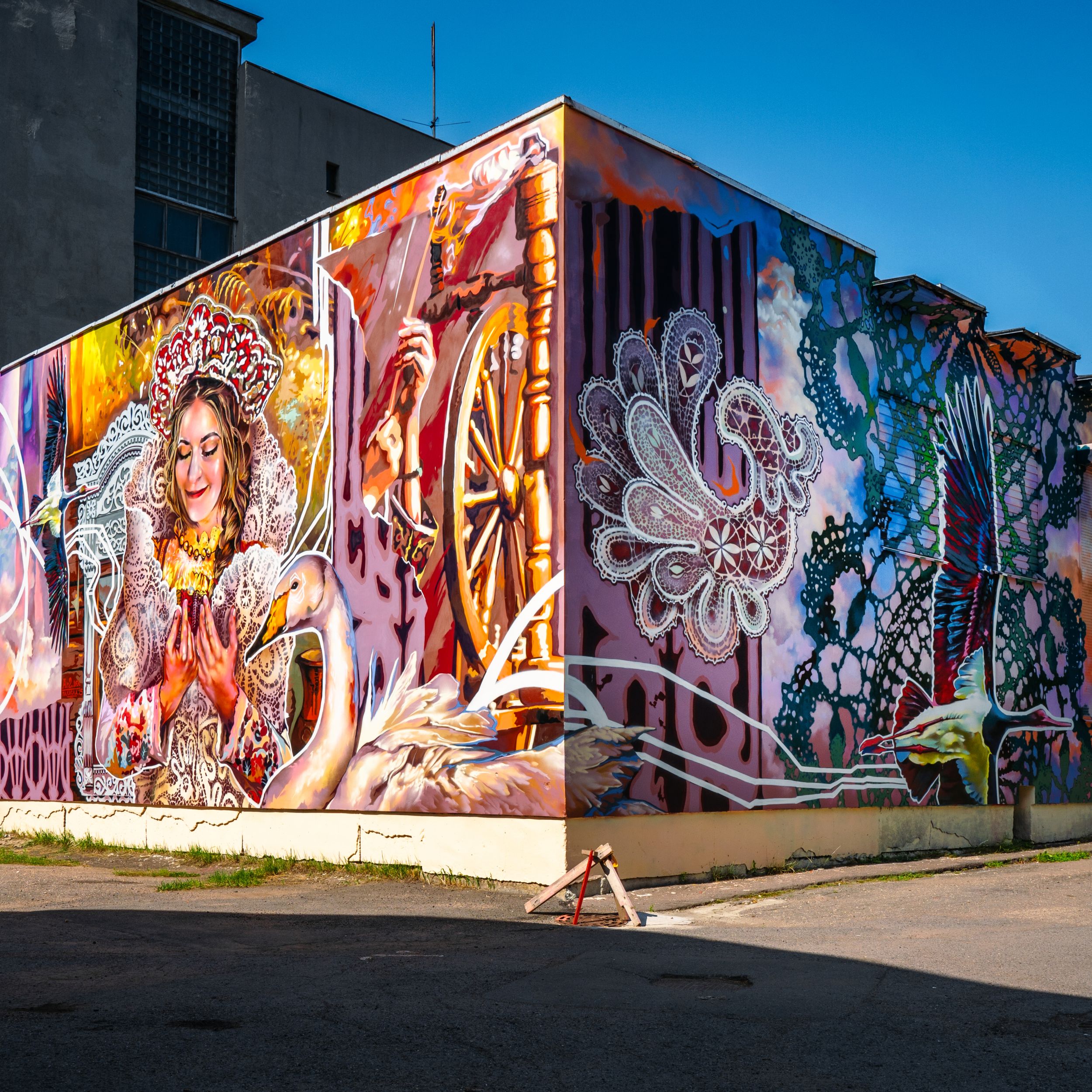 Один из самых трогательных и полюбившихся горожанам муралов рядом с роддомом. "Если аист поселился у вашего дома – это хороший знак", – сказал художник. Птица – как символ семьи, плодородия и новой жизни; эта добрая работа стала своеобразным талисманом места.