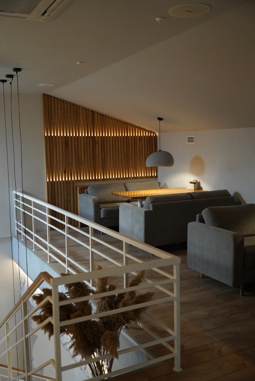Интерьер ресторана выполнен в сдержанном скандинавском стиле с высокими потолками, большими панорамными окнами, светло-серыми стенами, светло-коричневыми столами и множеством черных и белых интерьерных акцентов. В ресторане есть кальянная зона и игровая комната для детей.
